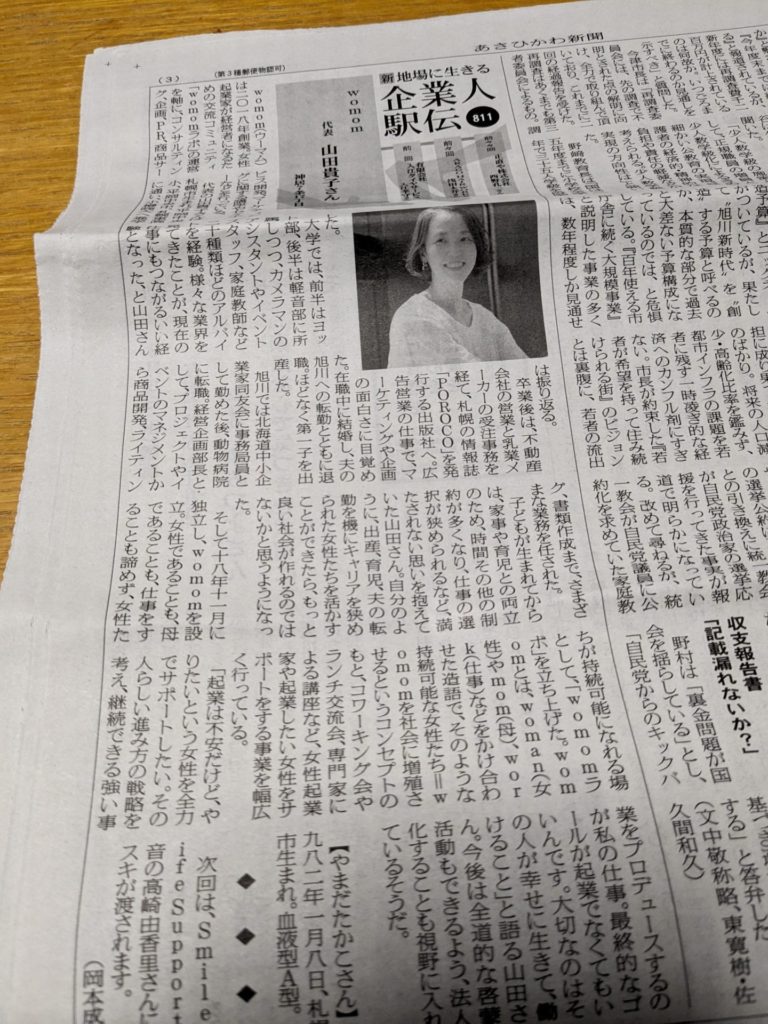 2024.3【あさひかわ新聞で紹介いただきました!】 2024.08.06 「あさひかわ新聞」にて「企業人」として取材いただきました。 ご紹介ありがとうございました。引き続き支援サポート、精進したいと思います。